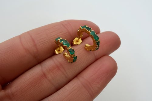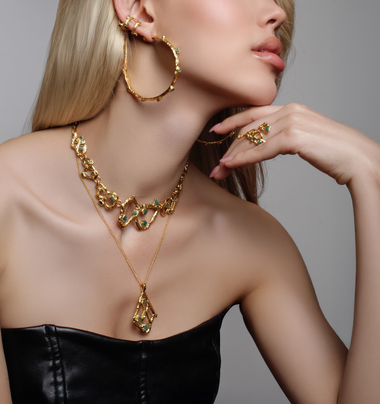 Brillo artesanal: pieza en bronce trabajada a mano, bañada en oro de 24K y engastada con esmeraldas en bruto. Descubra el proceso y la autenticidad detrás de cada detalle.